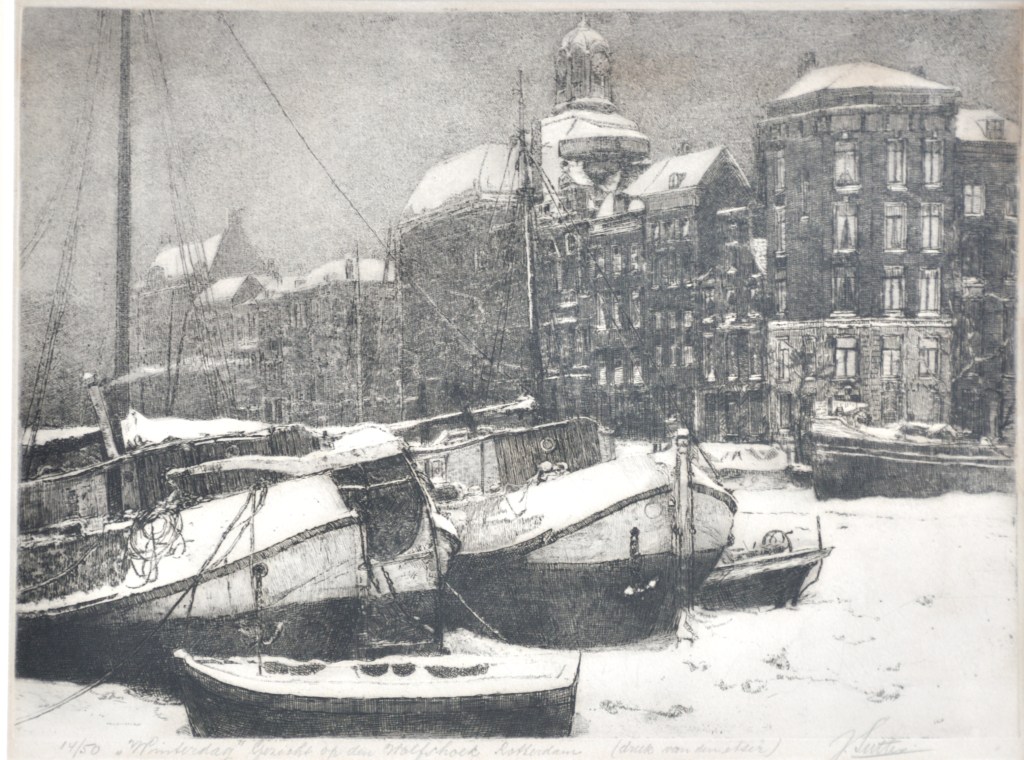 Annotatie l.o. in potlood “14/50 “Winterdag” Gezicht op den Wolfshoek Rotterdam” | Gesigneerd in potlood r.o.