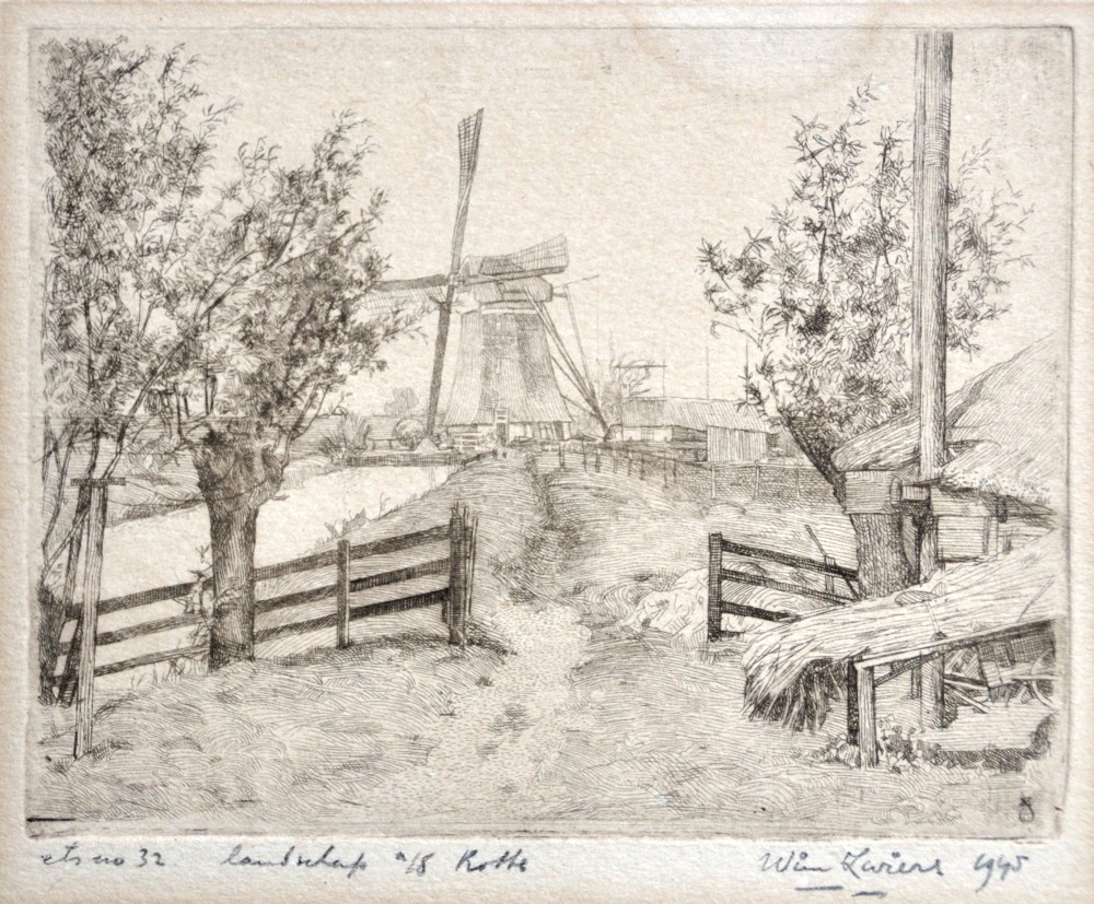 Annotatie l.o. in potlood “ets no. 32 landschap a/d Rotte” | Gesigneerd en gedateerd in potlood r.o. “1945”